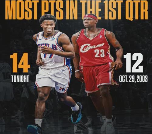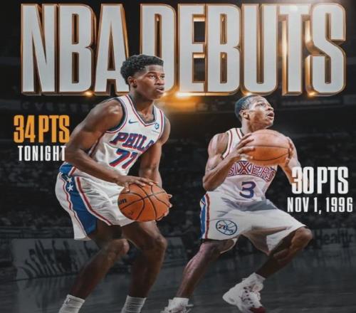 单场34分,埃奇库姆破了艾弗森的队史纪录,当初艾弗森在76人的生涯首秀是30分2篮板6助攻。
