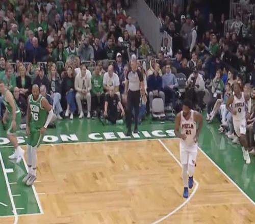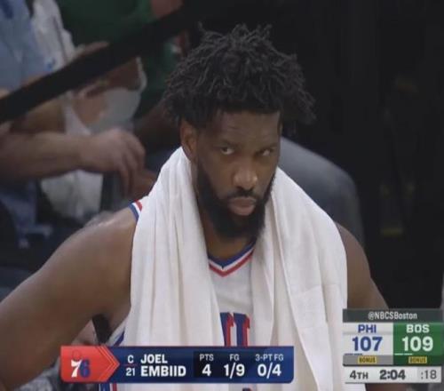 整个第四节,76人上演大逆转,但恩比德没有登场,被教练死死地按在替补席上。