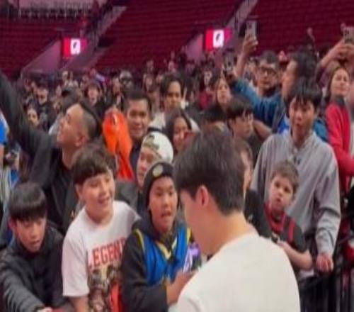 人气爆棚!大批球迷在通道等待杨瀚森,他将球鞋送给小球迷